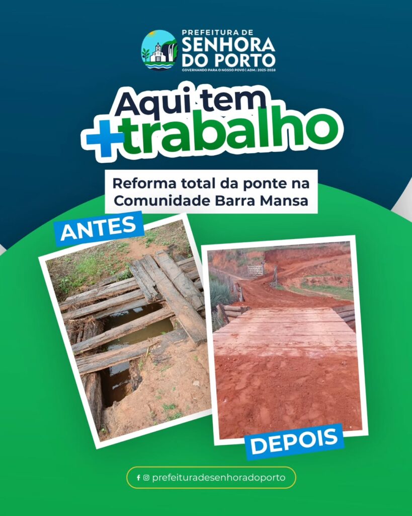 A Prefeitura de Senhora do Porto, por meio da Secretaria Municipal de Obras, realizou uma reforma total da ponte na Comunidade Barra Mansa.