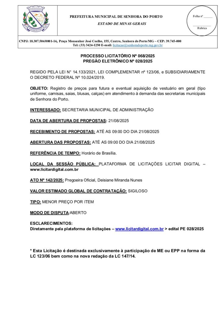Registro de preços para futura e eventual aquisição de vestuário em geral (tipo uniforme, camisas, saias, blusas, calças) em atendimento à demanda das secretarias municipais de Senhora do Porto.