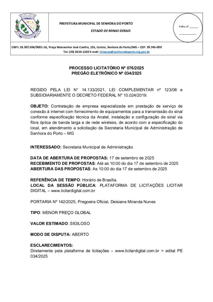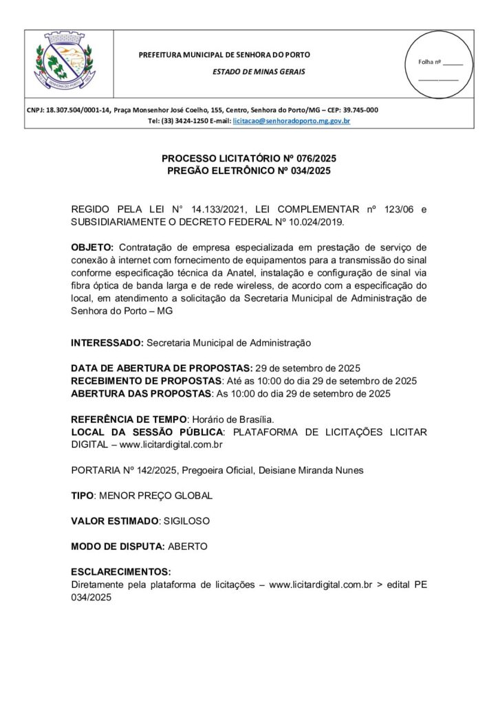 Contratação de empresa especializada em prestação de serviço de conexão à internet com fornecimento de equipamentos para a transmissão do sinal conforme especificação técnica da Anatel, instalação e configuração de sinal via fibra óptica de banda larga e de rede wireless, de acordo com a especificação do local, em atendimento a solicitação da Secretaria Municipal de Administração de Senhora do Porto – MG